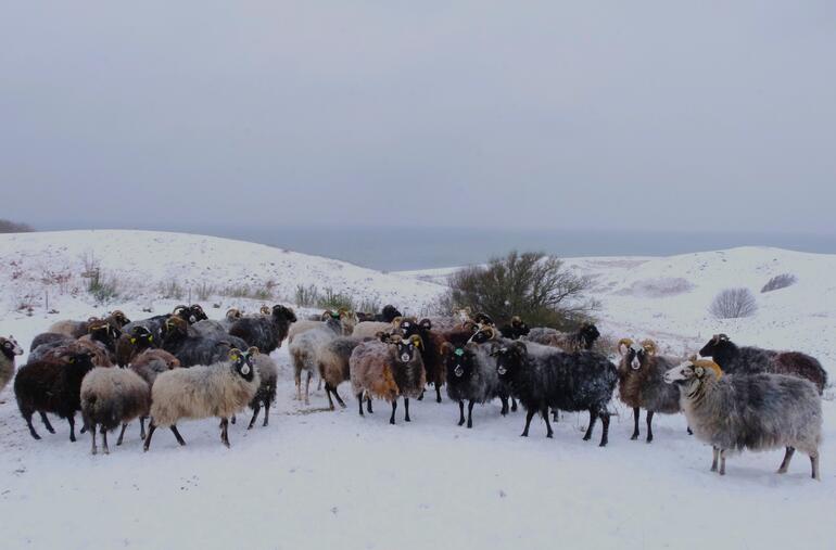 Gute fårene hygger sig i sneen